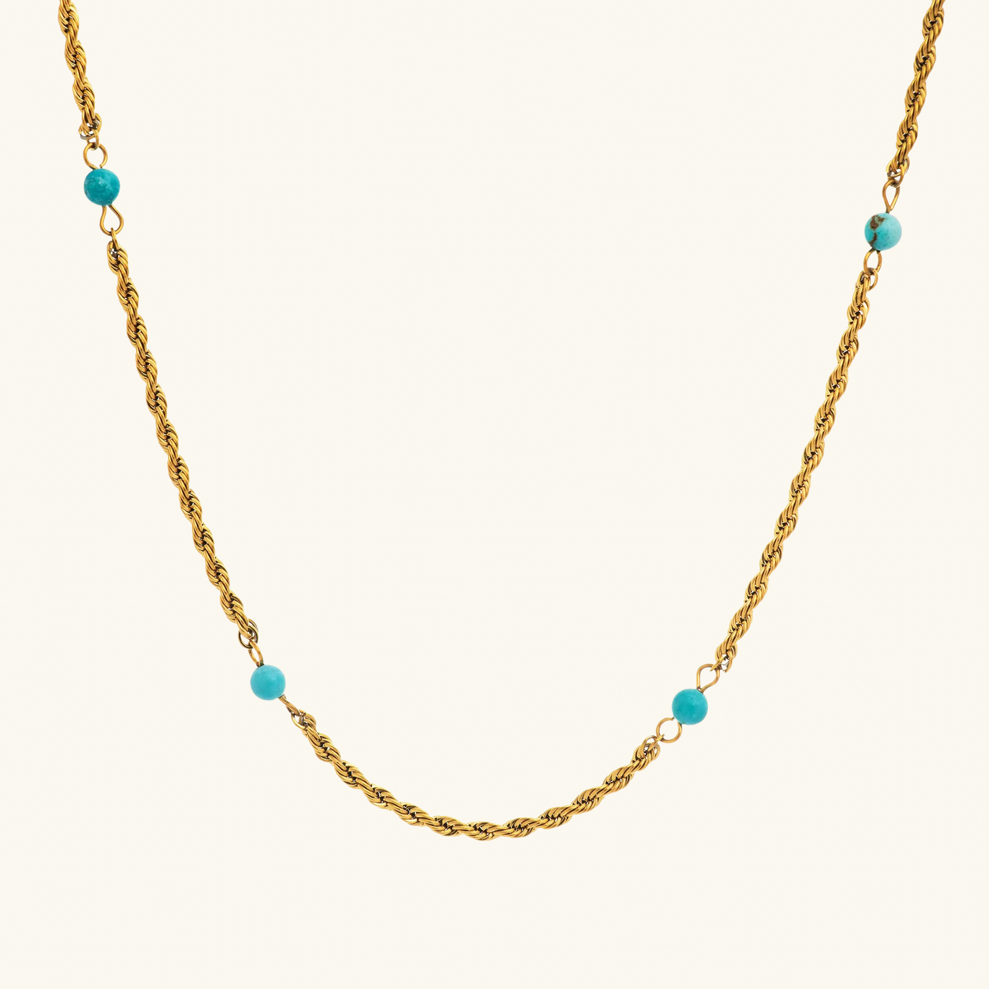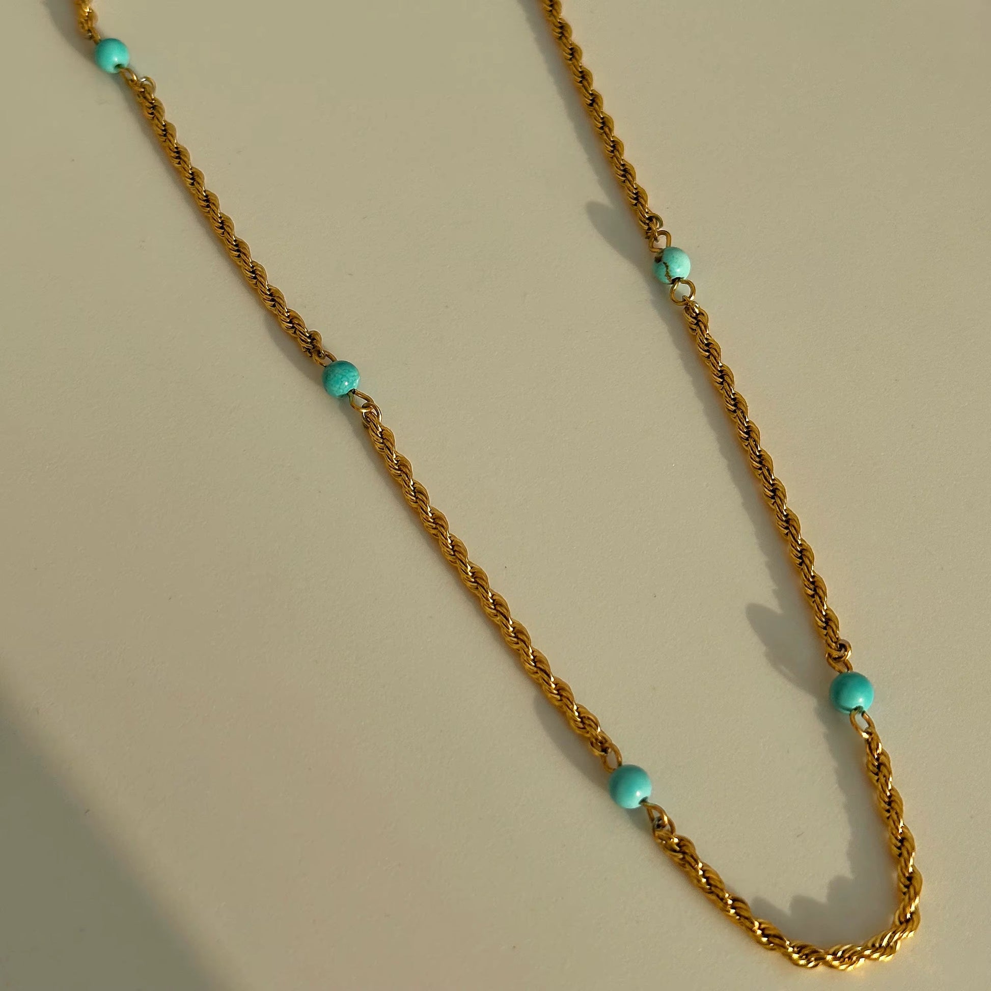 A golden rope chain with pops of turquoise beads for that perfect hint of color. Simple, chic, and ready to layer or wear solo ✨