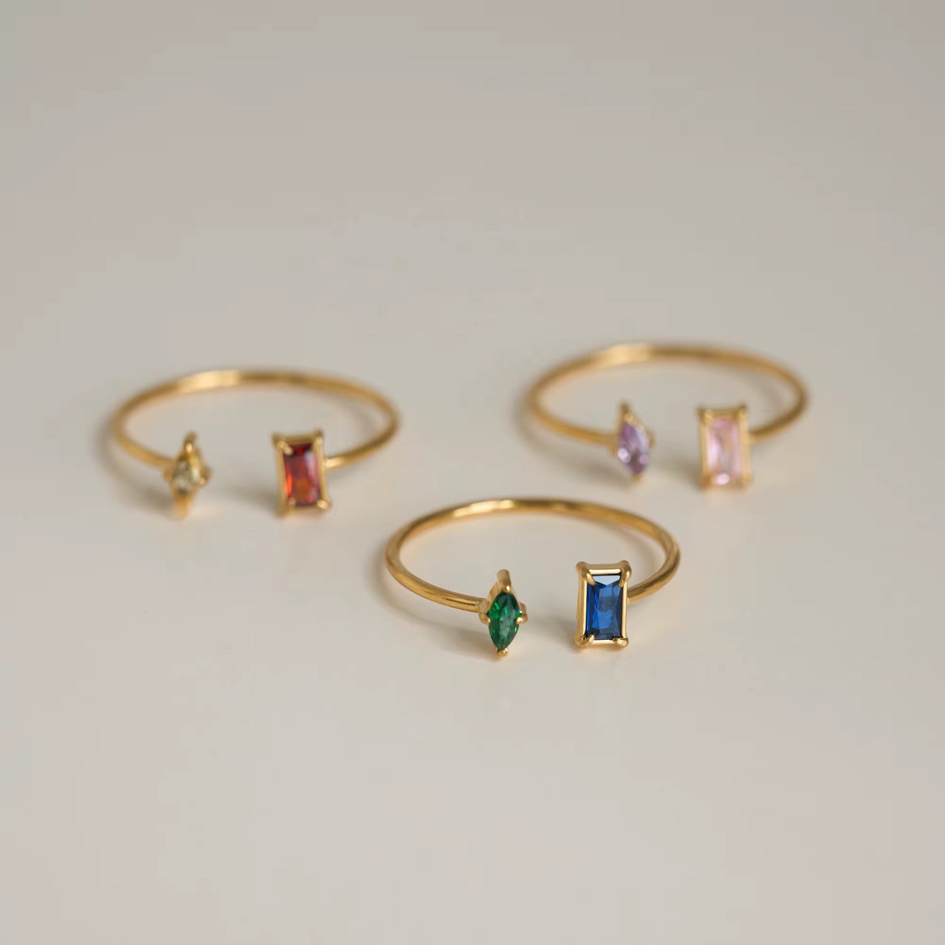 Add a pop of color and sparkle with the Dainty Showgirl Ring ✨. Featuring a chic duo of baguette and marquise-cut stones, this ring is perfect for stacking or wearing solo when you want just the right amount of shine. Lightweight, minimal, and full of personality—she’s the subtle statement piece every girlie needs.