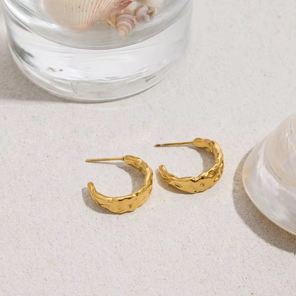 Our Molten Hoops are giving modern goddess energy ✨ With their organic, molten-gold texture, these hoops bring the perfect mix of edgy + chic. Lightweight, waterproof, and hypoallergenic—they’re your new everyday statement piece 💛